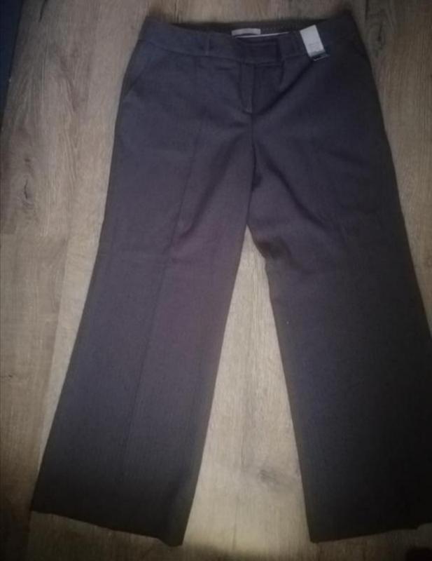 Темно серого цвета.Застегаеться на молнию пуговицу и два крючка.Есть лямку для пояса, спереди два кормана.Средняя посадка .Состоянте новое.Состав:100%полиестер.Размер указан 16.ПОТ-47,5см;ПОБ-57см;ДЛИНА-102см;ШАГ-74см;Посадка спереди-28см;Посадка сзади-35см;ПОштанини-32см;