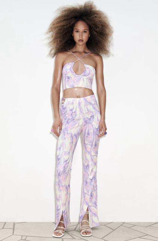Легкі літні брюки на високій талії з шнурівкою та застібкою-змійкою збоку. Тканина легка, приємна до тіла, не просвічується та трішки тягнеться. Напівобʼєм талії: 38 см, напівобʼєм стегон: 49 см, довжина штанів по боковому шву: 110 см, довжина «кроку»: 84 см.