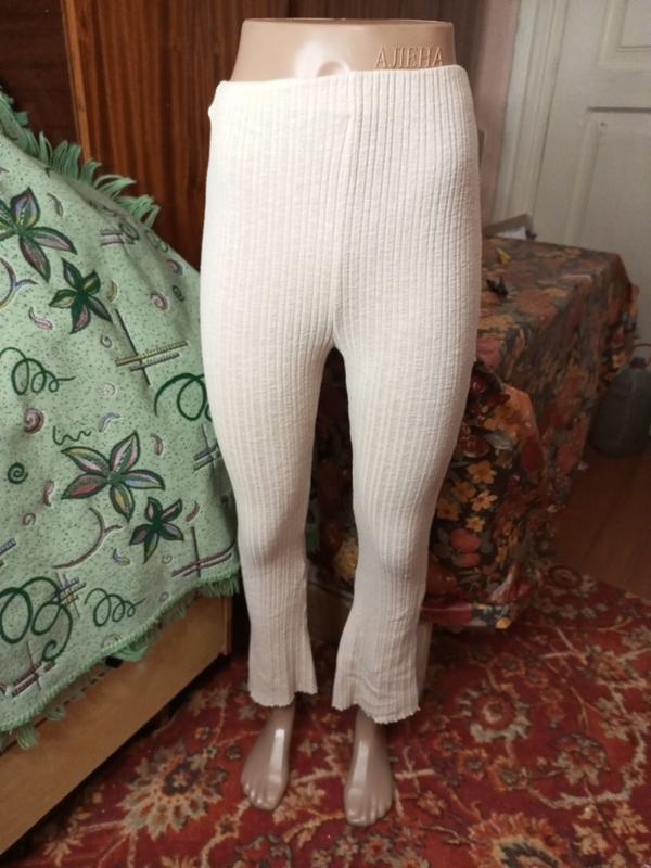 очень красивые молочные брюки на высокой посадке. Ткань приятная к телу и хорошо тянется. Размер 2хс, хс, с. опис состояние очень хорошее длина 98 пояс и пот 27 ширина бедер 42 посадка 30