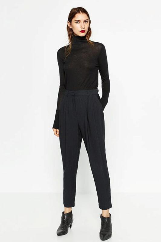 Штани базові чінос від Zara. Брюки з високою посадкою,передніми кишенями, декоративними задніми кишенями.Тканина щільна. Штани трохи завужені до низу. Розмір М Колір темно-сірий ПОТалии 39див ПОБІДИ 54см ПОштанины 15см Довжина 98см Довжина крокового шва 71см Фото на тілі немає!!!
