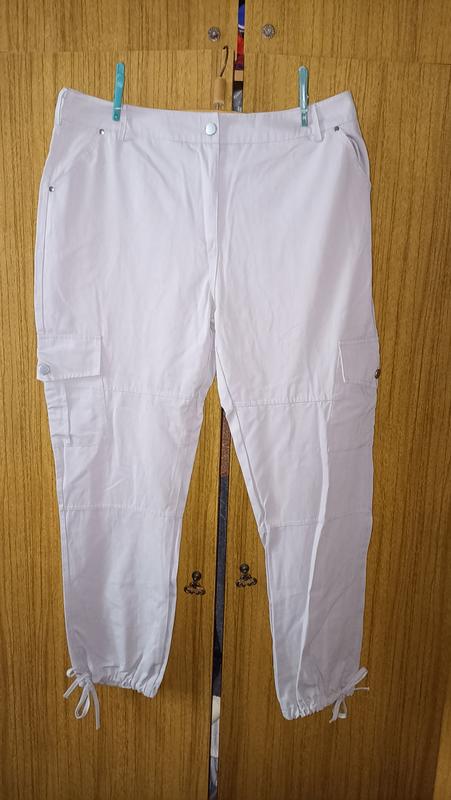 Суперские брючки. Много кармашков. Внизу можно затянуть на завязках. Не тянутся. То что надо на каждый день. ОТ 90 см ОБ 120 см Ширина штанины вверху 34*2 Длина 104 см шаговая 72 см