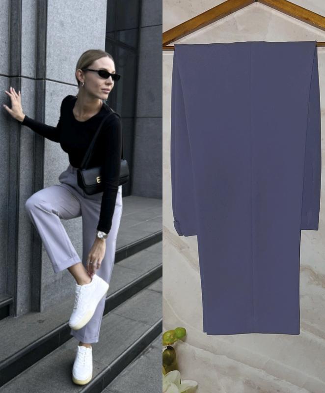 Стильные брюки в красивом цвете. Идеальное состояние, отличный сиреневый цвет. Модель зауженная, спереди на молнии. Размер м: ПОТ 37 см, ПОБ 53 см, посадка 31/40 см, длина 71/101 см.