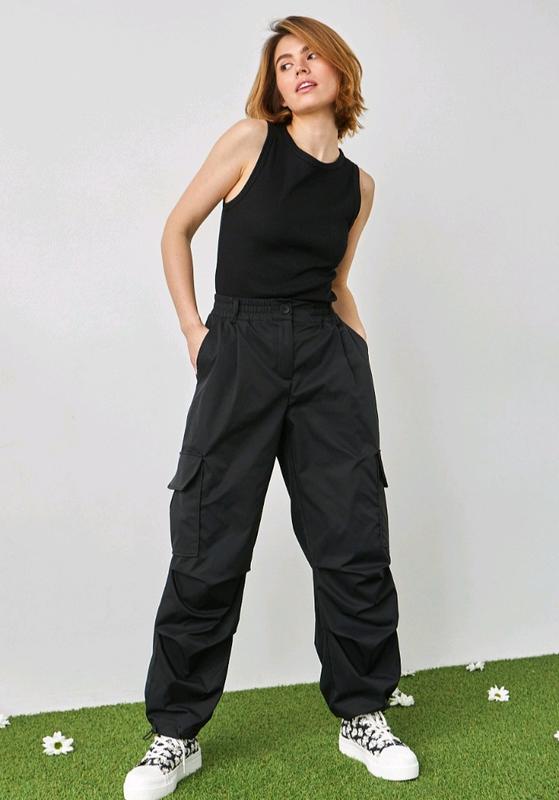 брюки карго , по боках кишені. по низу резинка. заміри: ПОТ 35см, ПОС 48см, довжина 89см, довжина шагового шву 66см, посадка 25/38см . бірки зі змістом тканини немає, важаю, що котон . тканина не тягнеться. країна виробник Турція, бренд Subdued