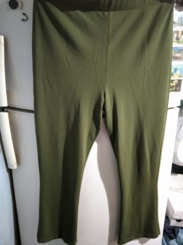 Брюки кольору хакі. В гарному стані. Тканина приємна на дотик і до тіла.ОТ88-110 ОБ104-140 Довжина 100 Посадка спереду 38, ззаду 44ще тягнеться. По низу невеликий кльош.