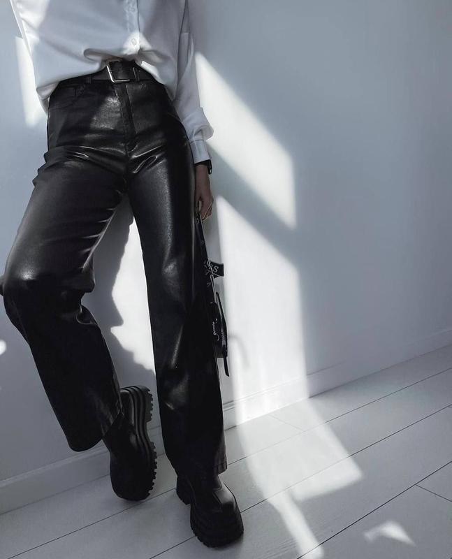 Утепленные брюки из матовой экокожи на флисе Размеры: 42-44, 44-46, 46-48 Ткань: экокожа на флисе Цвет: черный, мокко, св беж Длина изделия 104см Первый размер ОС до 92см Второй размер ОС до 99см Третьй размер ОС до 105см По желанию ремень плюс 90грн (черный обычный, отличается от фото)