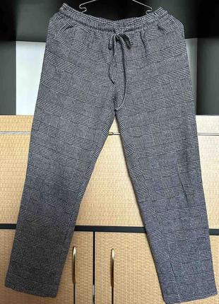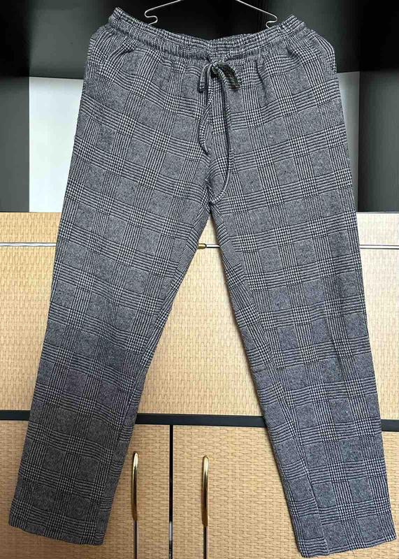 Штани з м’якої, теплішої та приємної на дотик тканини, у хорошому стані, тканина трохи тягнеться. Верх на резинці, додатково є шнурок-кулиска. Є бічні кишені, штанини донизу трохи завужені. Ширина пояса в нерозтягнутому стані – 35 см, тягнеться до 42 см; Ширина в області стегон – 50 см (тягнеться); Ширина штанини вгорі – 29 см, унизу – 17 см; Довжина – 86 см.