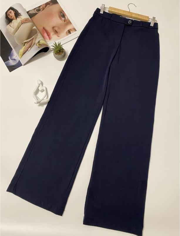 Брюки палаццо темно синего цвета Размер 36 Пот 36, поб 47, посадка 27, ширина штанины сверху 30, снизу 27 Бирка из состава отсутствует, на ощупь приятная ткань с добавлением вискозы и эластана, тянется