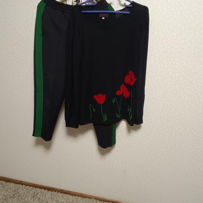 Кофта и брюки подобраны по цвету, повседневная, возможно менять и верх и низ,кофта хлопок, штаны эластан то есть больше синтетики,штаны укороченные 48 размера,кофта где-то 50 размру, это сток, замеры: брюки длина - 98см укороченный вариант, пояс резинка - 86см,бедра 130 см, кофта длина 70 см, рукав 66 см, грудь 90 см, все хорошо тянется