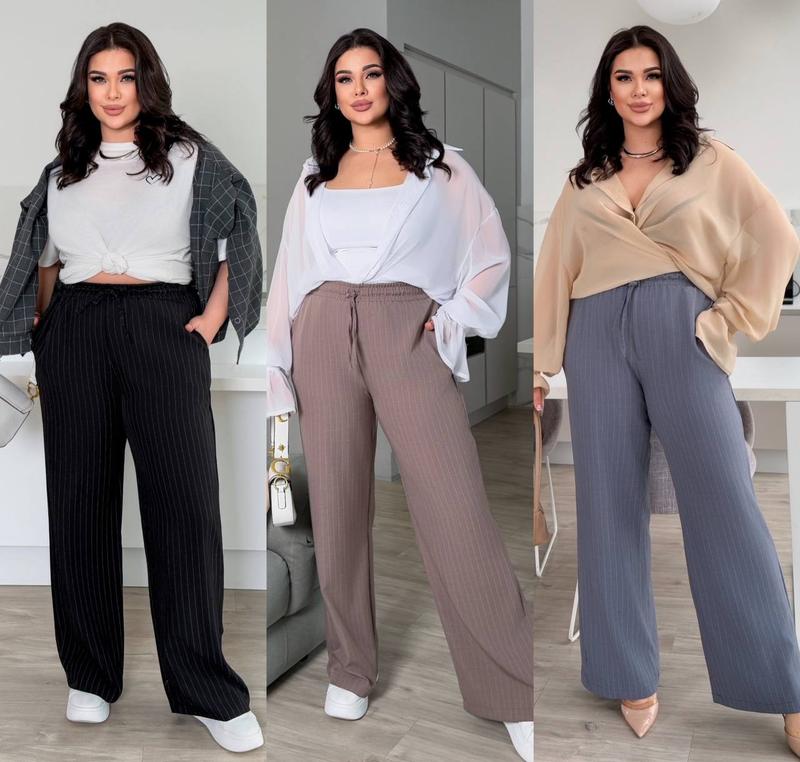 Брюки Арт 569хрз Ткань костюмный тиар (принт полоска) Цвет черный, серый, шоколадный Размер 50-52,54-56,58-60 Очень красивые удобные брюки из приятной ткани. Брюки высокой посадки, с карманами. Талия на резинке и канате.