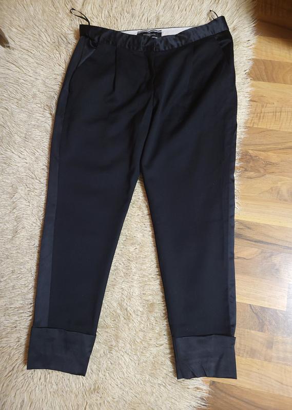 Брюки от бренда by malene birger. В хорошем состоянии. Нюансов нет. По бокам и внизу штанины вставки из атласа. Брюки на защелках. В составе шерсть и вискоза. Длина 93, талия 42, посадка 25 см, Бедра 57