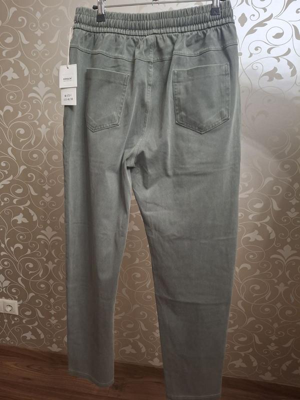Однотонные брюки под джинсы. Состав ткани: 45% коттона, 45% полиэстера и 10% эластана. Ткань средней плотности ближе к тонкой. На ощупь, как тонкий стрейчевый джинс. Тканина тягнеться прекрасно. На талии круговая резинка+ шнурочек. По бокам и сзади есть накладные карманы. Посадка высокая. К низу брючки идут прямые и в самом низу слегка заужены. Производитель: фабричный Китай.