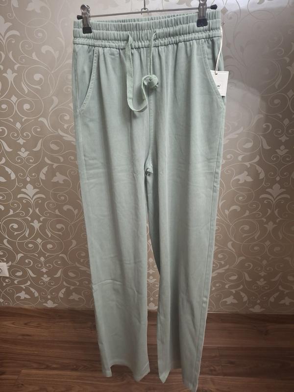 Состав ткани: 45% коттона, 45% полиэстера и 10% эластана. Ткань средней плотности ближе к тонкой. На ощупь, как тонкий стрейчевый джинс. Тканина тягнеться. На талии круговая резинка+ шнурочек. По бокам вбитые карманы, сзади есть накладные карманы. Посадка высокая. К низу брючки идут расширенные - палаццо Производитель: фабричный Китай.