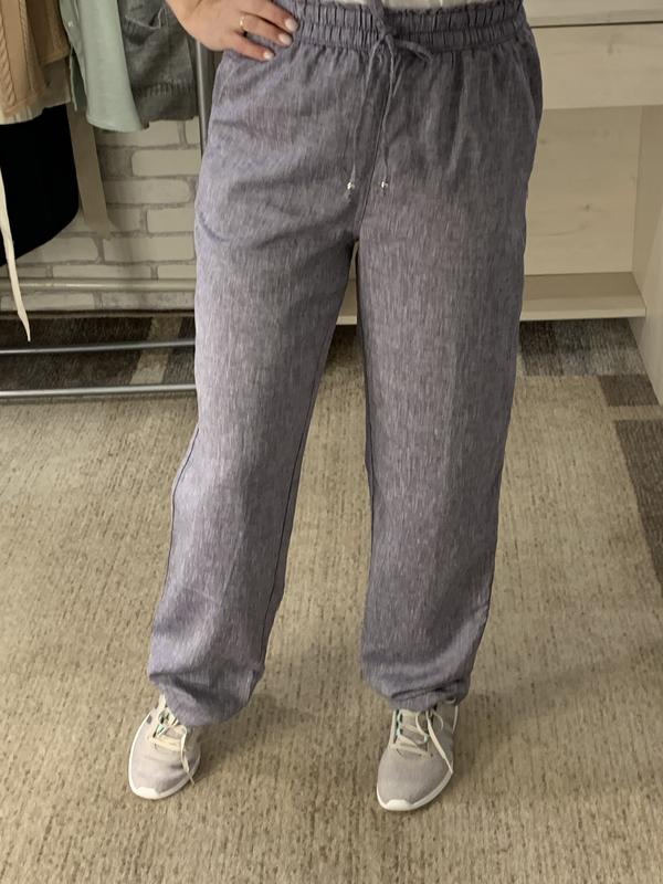 Голубые брюки-55% льна, 45% вискозы-размер M: по резинке 36( тянется до 47), бедра 53, длина 100, шаг 65, посадка 37-32, ширина штанины у промежности 30, ширина внизу 19 см