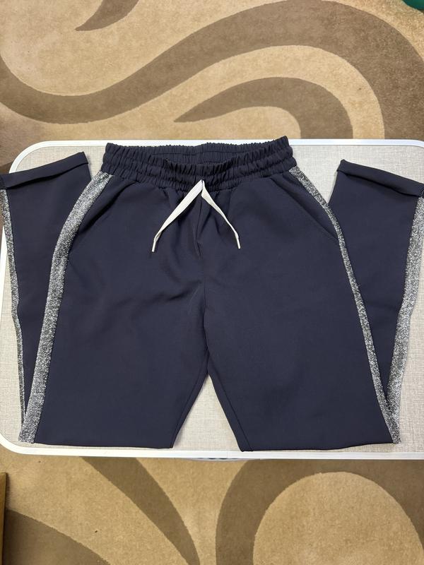 Цвет темно - синий Размер 44 - 46 с лампасами Длина 90 см В стегнах 48 см В талии на резинке 30 см, но еще потянусь до 45 см