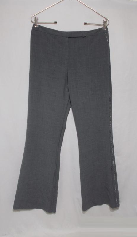 Брюки в отличном состоянии. Ткань тонкая, тяжело струящаяся (300 грамм), эластичная, меланжевого серого цвета. Высокая посадка, широкие штанины, зауженные в колене, вдоль боковых швов декоративная строчка толстой белой нитью, без карманов, застежка на молнию, хлястик с крючком и внутреннюю пуговицу, без подкладки. На оф сайте подобные стоят 60€ Состав: 53% ПЭ, 43% шерсть, 4% эластан; подкладка (пояс): 57% ацетат, 43% полиамид Мерки (на бирке UK14): полупояс - 41см ПОБ - 51 см посадка - 27/38см длина - 106/81см штанина - 31/23/28см