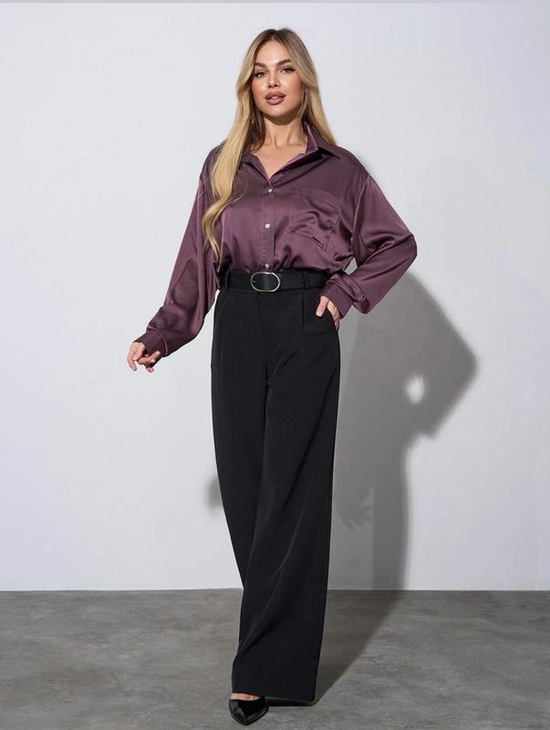 Брюки палаццо ISSA, размер М Черные классические брюки из костюмки с прямым кроем. Высокая посадка, сзади брюки на резинке, соответственно очень удобные ( не давят и подойдут под любую фигуру). Длина - 105 см Довжина по внут. шву - 75 59% поліестер, 21% елестан, 20% бавовна