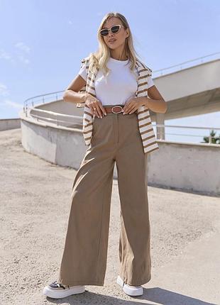 Арт. 14824 Бежеві повсякденні штани прямого широкого крою з високою посадкою на талії. Модель з кишенями оснащена застібками на ґудзиках і блискавці, поясними шлевками і гумкою ззаду на поясі. Модель виконана з однотонної джинсової бавовни. Ремінь в комплект не входить.