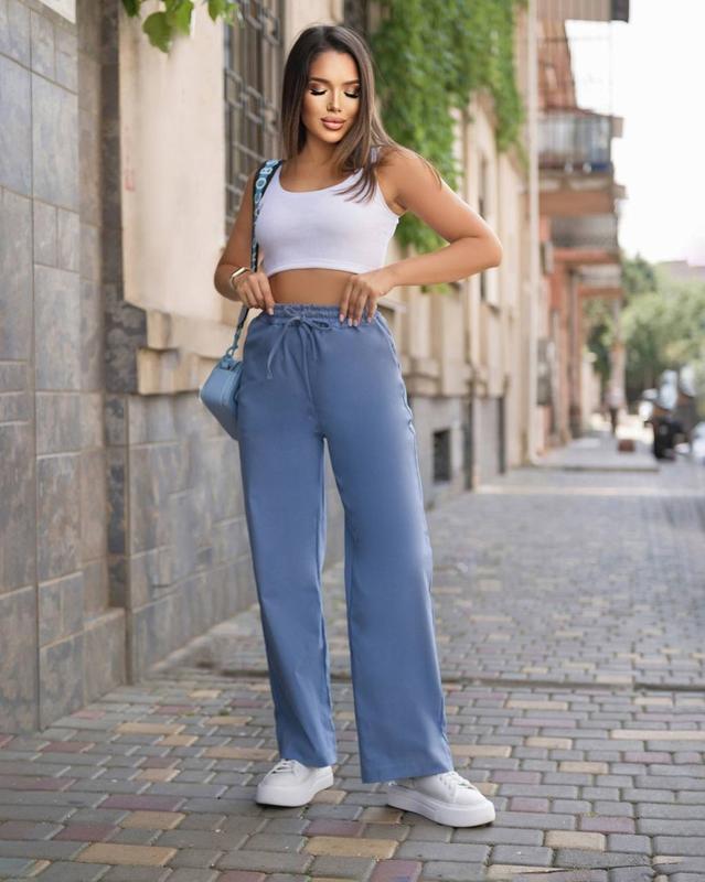 Штани №678 Цена-650грн размер 42-44,46-48,50-52,54-56 тканина легкий джинс цвет голубой Женские стильные брюки палаццо из легкого джинса. Высокая посадка на резинке. по бокам карманы хулиганы. ОТ 42-44-32см,46-48-36см 50-52-37см,54-56-40см ОБ 42-44-53см,46-48-56см 50-52-61см,54-56-64см Длинная 42-44-105см,46-48-106см 50-52-107см,54-56-108см
