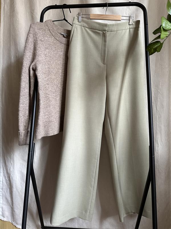 Брюки из плотной, мягкой костюмной ткани очень красивого цвета( её на последнем фото). Спереди карманы. Пояс сзади на резинке что очень удобно. Размер указан L. Состояние идеальное