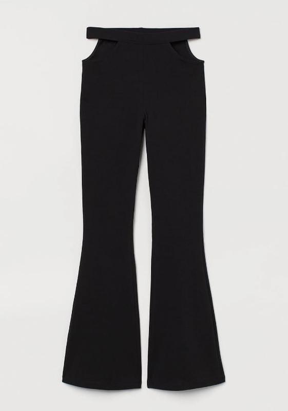 Расклешенные брюки из плотного трикотажа. Высокая талия с вырезами по бокам. Эластичный пояс. 94% хлопок, 6% эластан. Обхват талии 82-86 Обхват бедер 108-112
