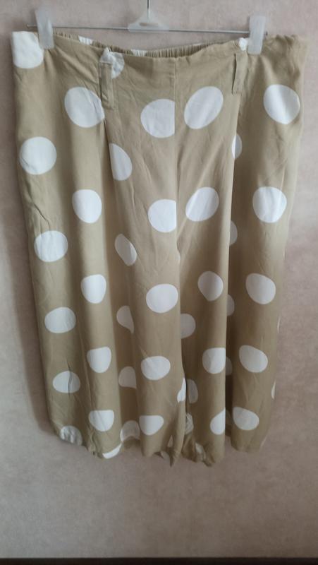 Легкие натуральные укороченные колоты большого размера в горох. Имеют два кармана по бокам, пояс сзади на широкой резинке и с лямками для пояса. Замеры : длина -80/49см, пот-47-57см, пост-75см, ширина штанины снизу -40см.