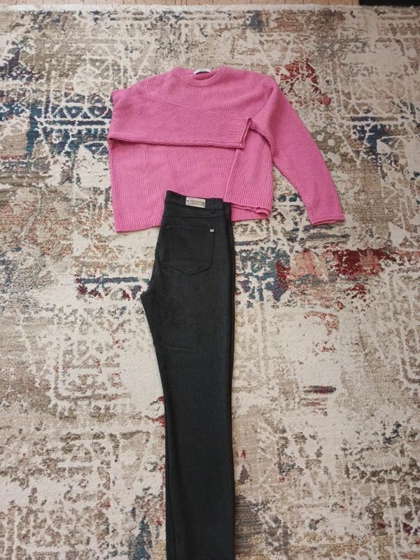 отличные брючки! классика! цвет темно-серый! состояние идеальное! размер 36 состав вискоза, полиестр ! очень приятные к телу! пот 38 ПОБ 45 посадка 26.5/36.5 внутренний шов 70 внешний 95 ширина брючины снизу 14.5 цена 210гр свитер bershka оверсайз размер s подойдёт и на М и на L. цена 200