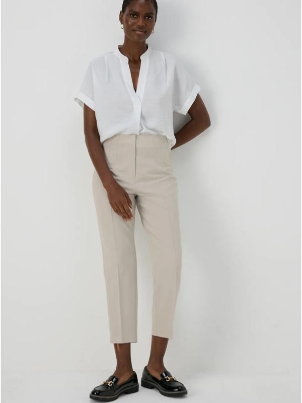Брюки, штаны цвета айвори. Высокая посадка, спереди защипы. По линии талии с середины сзади пришита резинка для лучшей посадки. Застегиваются на пуговицу, два крючка и молнию. Стан идеален. Размер по набору 20. Карманов нет. Замеры: талия - 52см, бедра - 63см, длина по внутреннему шву - 67см, посадка спереди - 37см.