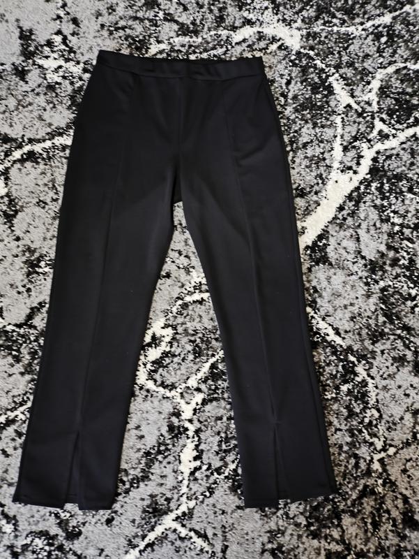 Продам черные брюки с разрезами спереди. Длина по внешнему шву 97, длина по внутреннему шву 69,5, полуобхват талии 41, растягивается до 50, полуобхват бедер 51, растягивается до 54 см.