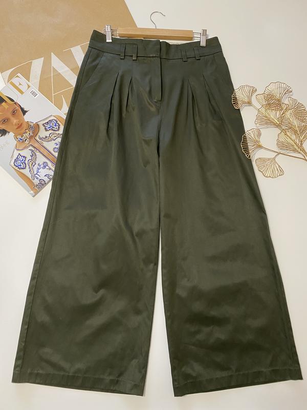 Широкі брюки з защіпами, трішки вкорочений фасон. Темно зелений колір. Висока посадка Розмір 12 Пот 41, поб 59, довжина 97, посадка 37, ширина штанини знизу 32, зверху 36