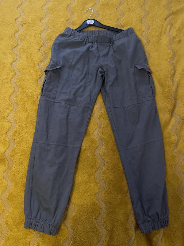Снизу и сверху на резинке, цвет коречнвато-серый, есть карманы