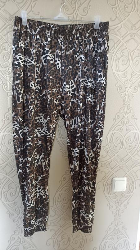 Леопардовые брюки большого размера. Манжеты и пояс на резинке. Имеют два кармана. Ткань очень качественная, средней плотности, красиво растягивается. Замеры : длина -96/74см, посадка -32/44см, пот-41-61см, пос-70+см.