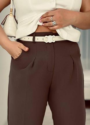 0445 Тканина: костюмка Колір : шоколад,чорний, бежевий Розмір: 42-44 46-48 50-52 Штани мають класичний прямий крій. Вони досить широкі та вільні, що робить їх придатними для ділового чи повседневного стилю,бічні кишені, що додає практичності,класична блискавка та гудзик,позаду резинка. У продажі без пояса.