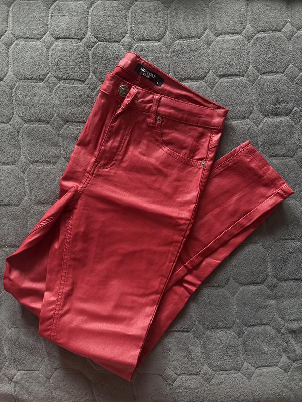 Червоні штани, ррзмір L, але краще на М. Ідеальні, красиво по фігурі, тримають форму, матеріал ніби з шкірзаму. Великі кармани ззаду, фурнітура, все в ідеальному стані, взагалі без слідів носки.