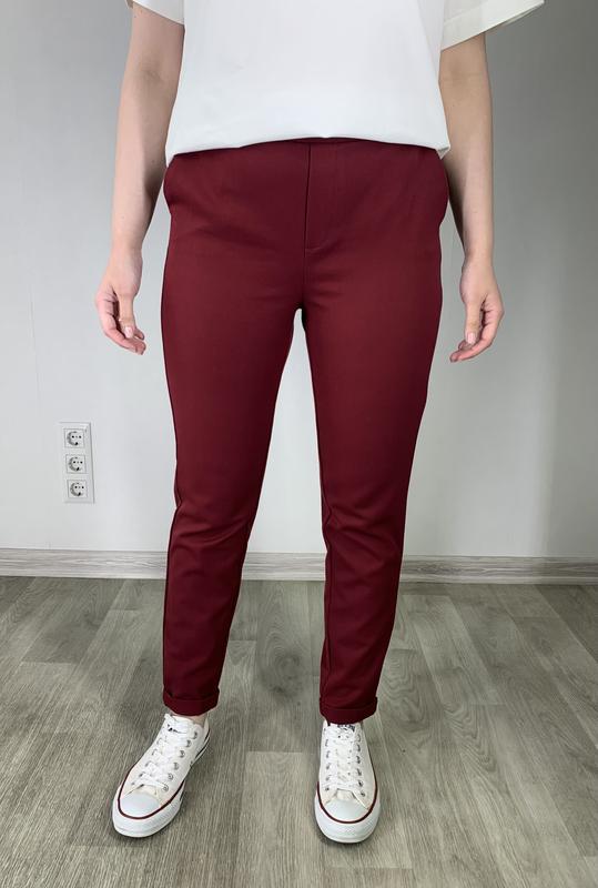 Брюки бордового цвета На размер М-Л Длина 95 см, полуобхват талии 38 см( тянутся до 43 см), полуобхват бедер 48 см Сзади на талии резинка Бирка со складом срезанная, очень приятные на ощупь Стан - идеальный