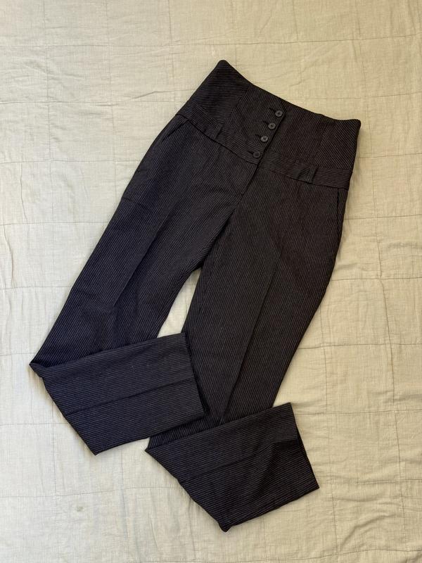 Брюки Monton, сіро-коричневі в світлу смужку, цікава модель, завищений пояс, гарний склад, 29% вовна, розмір 38. Стан ідеальний. Заміри. Ширина по поясу-41, довжина по боковому шву- 109, включаючи високий пояс, без пояса- 95 см, довжина по внутрішньому шву-79.