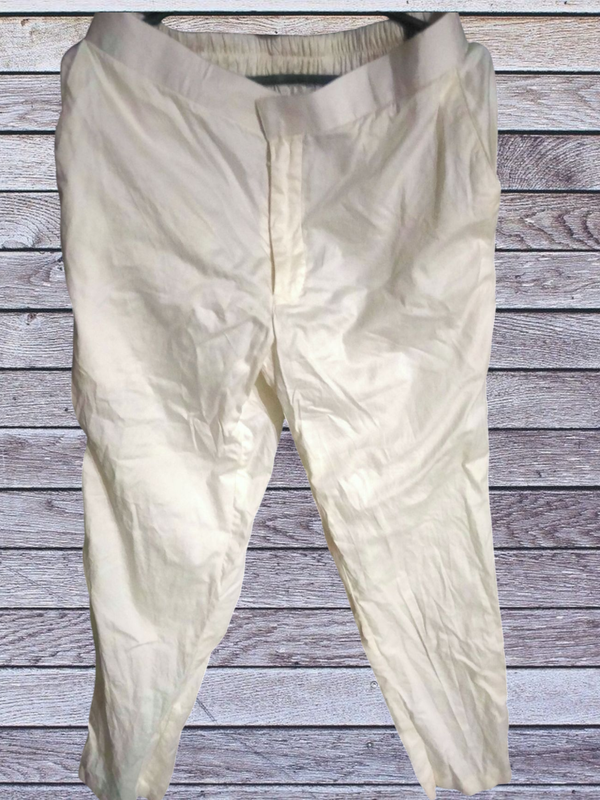 Цвет пряжного молока,глянцевый хлопок структуры тоненького шелка,пояс на резинке,глубоченные прорезные карманы, книзу зауженные, без ярлычков. пот 42/50 поб 50 Д 104