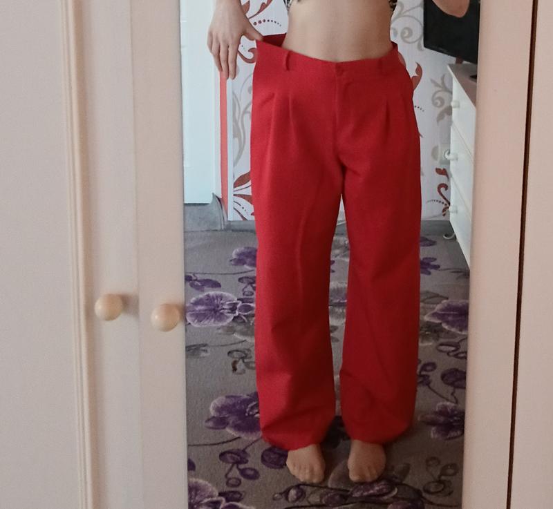 Красные модные брюки. Хрупкий цвет, который придаст яркости твоему образу. Изготовлены из качественного материала. Подойдут как для офиса, так и для прогулок по городу. Длина брюки- 106см Мои параметры на фото: талия -70см, бежедра-90см
