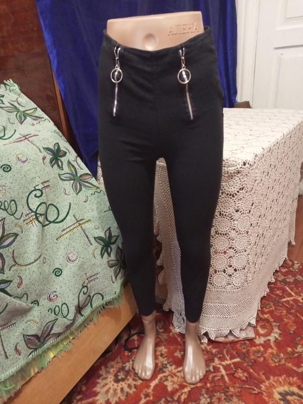 очень красивые брюки на высокой посадке с декором молнии. Ткань приятная к телу и хорошо тянется. Размер с, м. Имеются нюансы, по бокам как убитый и в такой как причина резинка. опис состояние очень хорошее длина 92 пояс и пот 31 ширина бедер 44 посадка 31
