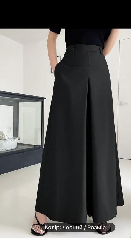 Брюки палаццо чорного кольору, синтетична тканина, по бокам кармани, розмір L, на обʼєм стегон 100-106см, талія 75-81. Довжина По зовнішньому шву 104см, По внутрішньому-78см
