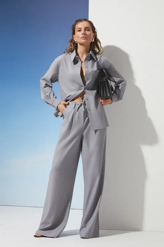 Серые широкие брюки с резинкой и завязками в поясе 80% льна