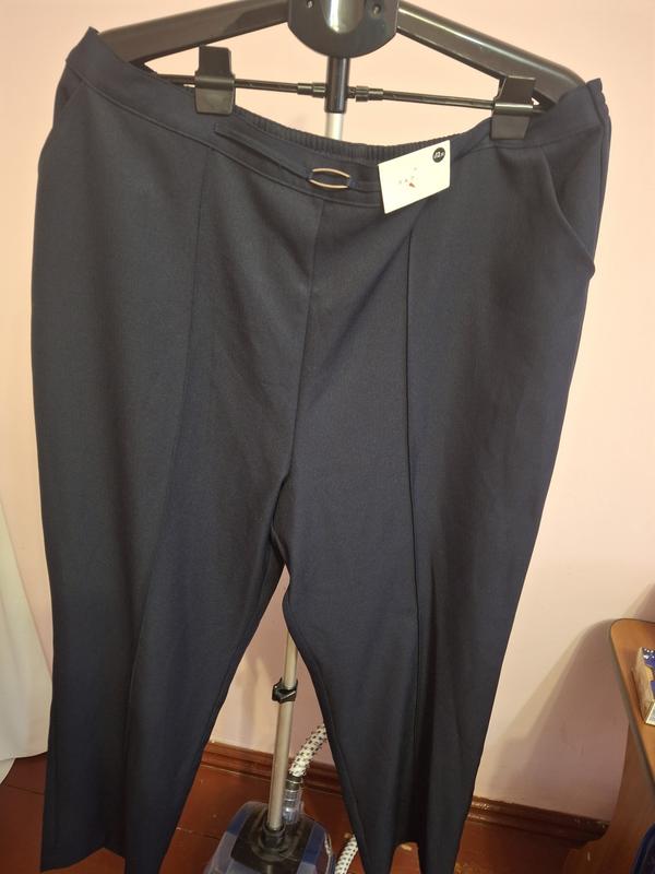 брюки женские, темно синий цвет, по переду застрочен шовчик, есть карманы, сзади есть резинка. длина изделия 100, пог-50, поб-62, ширина внизу 22, ширина шагу