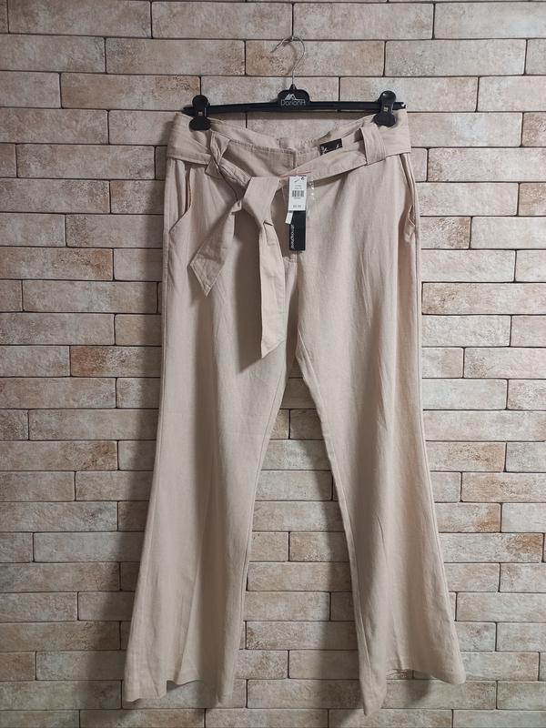 Льняные брюки от бренда Primark. Удобные, легкие и практичные. Фасон свободного кроя. Есть два боковых кармана. Цвет беж. Размер 16. Подойдет на XL-XXL. Состав:,. Замеры: длина см, шаг. шов см, пояс см, по об см, посадка см.