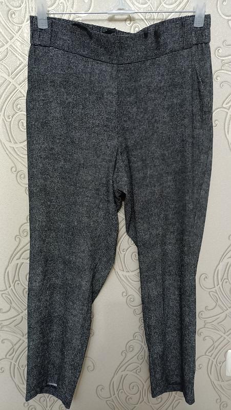 Летние, укороченные брюки. Ткань средней плотности, немного растягивается. Пояс сзади на резинке, имеют боковые карманы. Замеры: длина -85/63см, посадка-30/42см, пояс-41-53см, пост-51-55см, ширина штанины снизу -17см