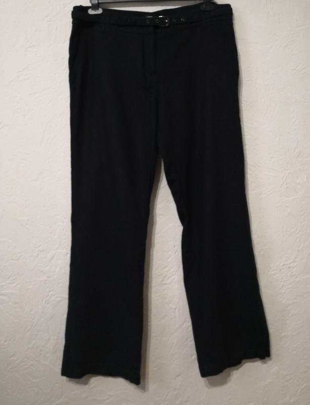 Женские брюки черного цвета, выполненные из вискозного льна Средняя посадка на талии, застегиваются на молнию и крючки.. По бокам добавлены прорезные карманы. Замеры: ПОТ-47 ПОБ-56 Посадка-32 Длина шерсть.шва-104 Довжина внутр.шва-79 Ширина штанки внизу - 26