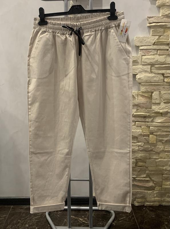 ЩЕ БІЛЬШЕ ГАРНИХ РЕЧЕЙ НА МОЇЙ СТОРІНЦІ! Підпишіться 🔥🔥🔥 Штани літні, легкі, висока посадка, резинка на талії кругова. Всі заміри вказані у спокійному, тканина дуже добре тягнеться Колір бежевий 👇👇👇 4ХЛ наш 52 ОТ 75 см ОС 112 см Довжина 97 см