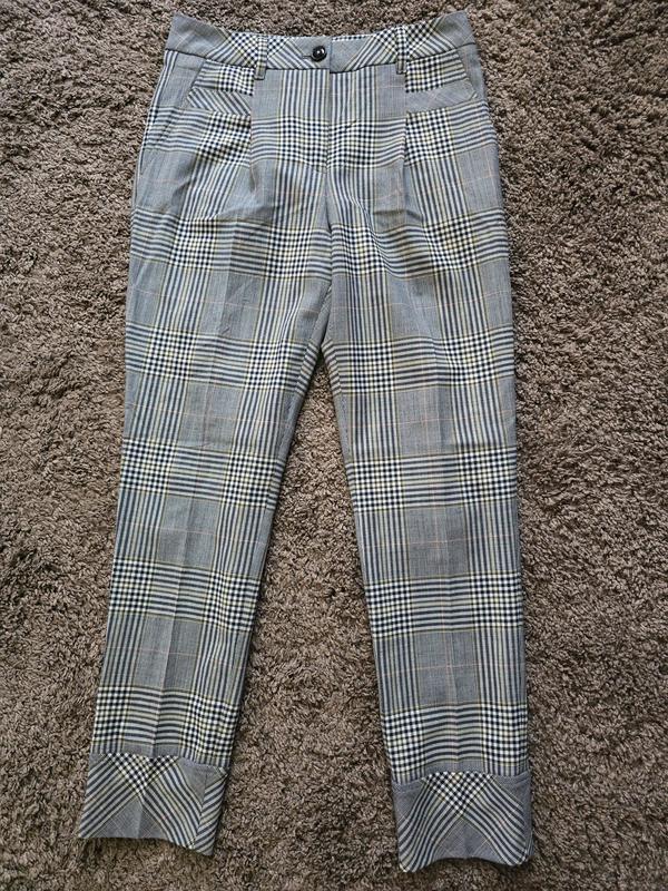 Классные брюки ;высокая посадка.Сидят по фигуре.на рост 164 они нормальной длины ,на рост выше будут сидеть как на фото на модели.длина 99 пояс 37 бёдра 48.Отправка Новой почтой после оплаты на карту