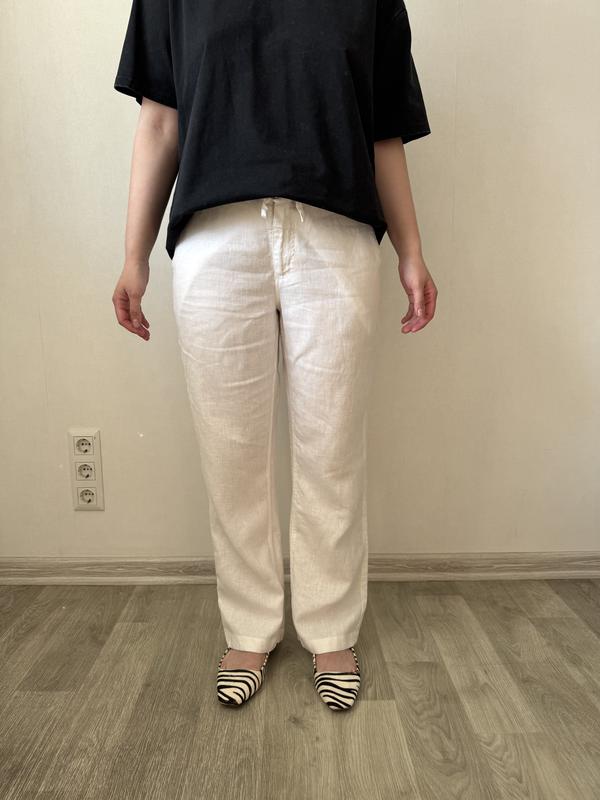Брюки білого кольору Розмір Л У складі 100% льон😍 Довжина 101 см, напівобхват талії 44 см(є шнурок, можно затягнути), напівобхват стегон 57 см, посадка попереду 27 см Стан ідеальний