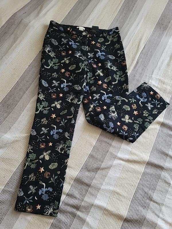 очень красивые, необычная ткань, рисунок как вышивка с золотистой нитью. Подойдут на любой сезон. Талия 40, бедра 50, посадка 25/37, шаг 70, длина по бокам 95, ширина штанины 17. За потреби надам ще фото.