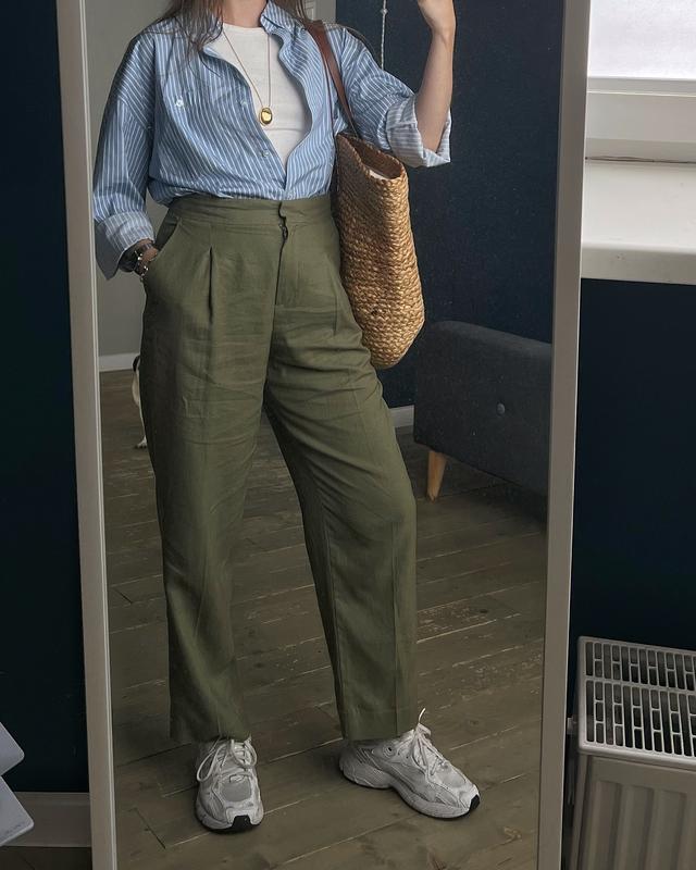 Злегка завужені і вкорочені штани з льону. Хакі оливковий зелений. Висока посадка. З кишенями. В ідеальному стані.