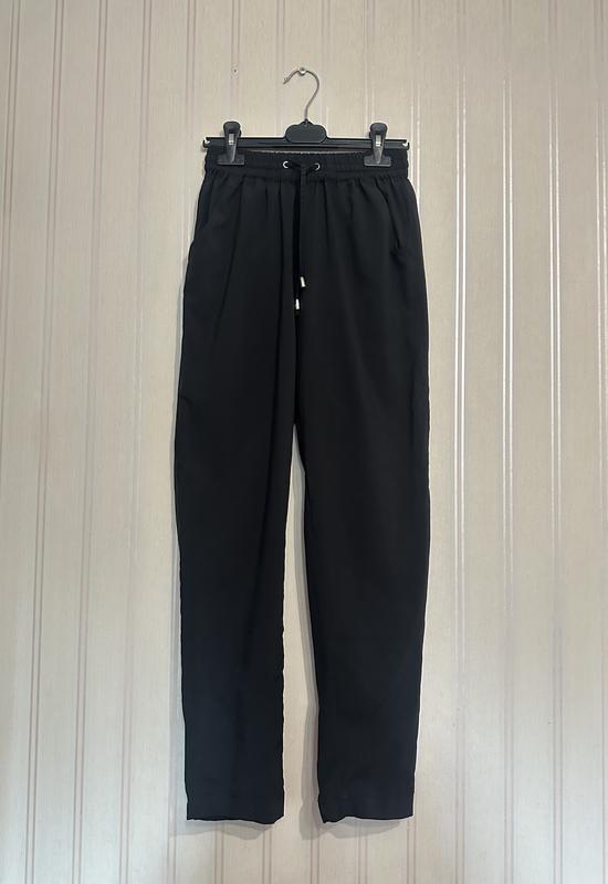 Классные летние брюки Черного цвета На талии резинка и завязки По бокам карманы Легкие и удобные На бирке М, но маломерят на S,XS Замеры: пот-29см( тянется до 39см) , поб-48см, длина по боковому шву- 92см, шаговый шов -66см